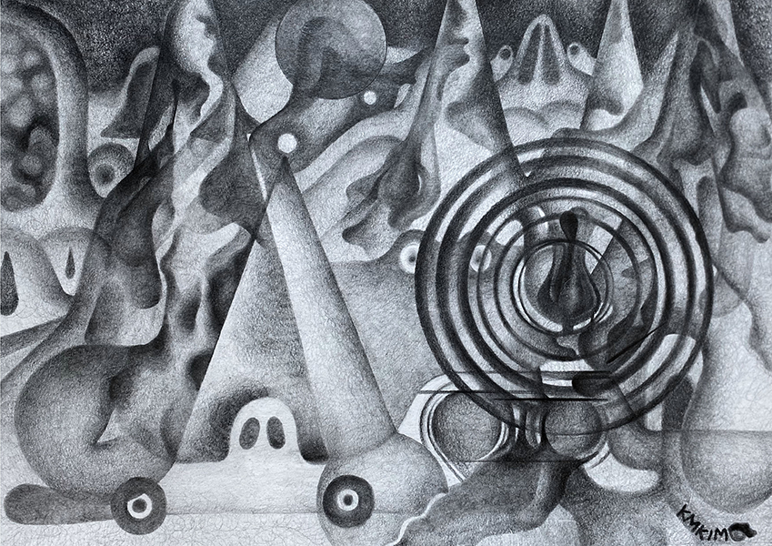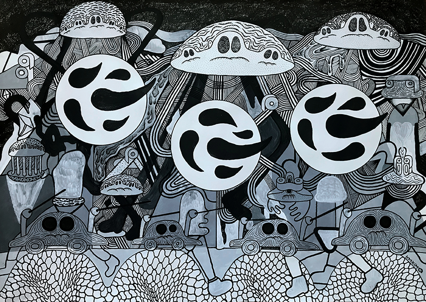 Sa créativité trouve ses sources dans une recherche entre la frontière inconsciente du réel et de l’irréel ; Des expressions graphiques prolifiques qui nourrissent son imaginaire et un goût prononcé pour la saturation.