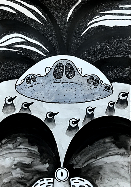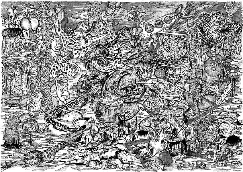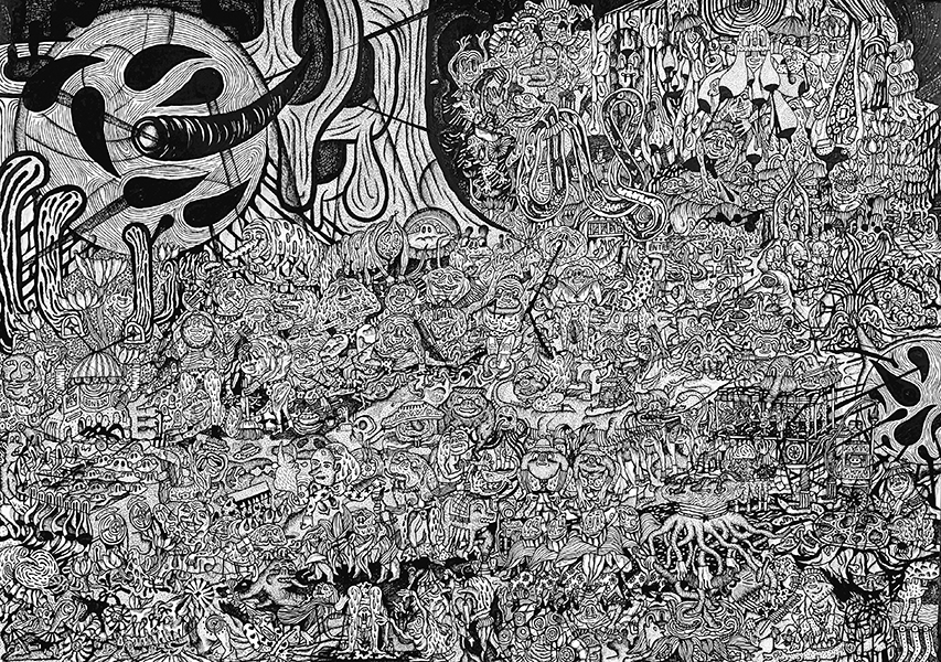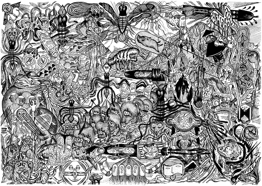 “Vincent Wagnair est un dessinateur et auteur de bandes dessinées. Né en 1982 à Thionville en France, il arrive à Bruxelles en 2003 pour y suivre des études en Graphisme à Saint-Luc. Influencé par Gary Panter, le comix underground américain des 70′, l’art brut et populaire, et la scène du graphzine dans son ensemble, l’artiste remplit depuis lors des feuilles de papier de façon compulsive avec une méthode héritée de l’écriture automatique et du Cut-up. Vincent Wagnair dessine principalement à l’encre de chine, et est également imprimeur sérigraphe au sein du collectif Ice Screen, basé à Bruxelles.
