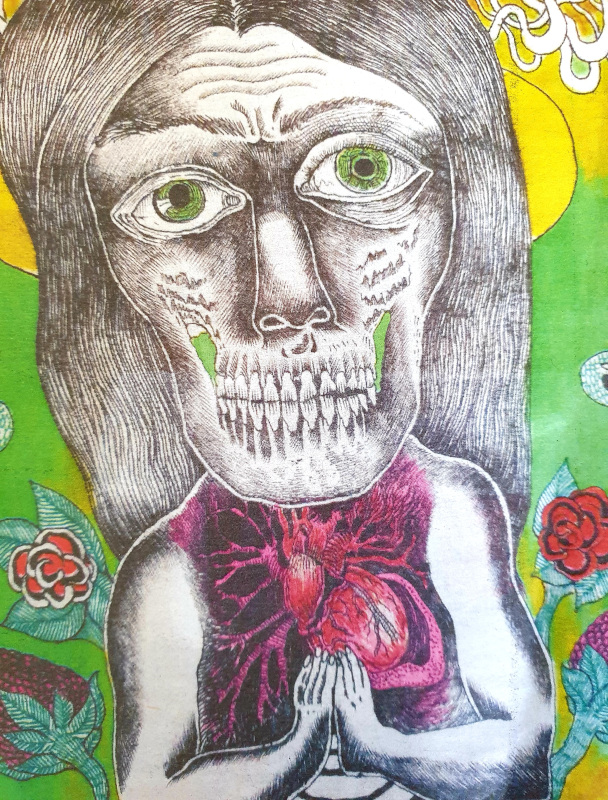L’art du paño (mouchoir en espagnol) est une tradition carcérale qui perdure au sud ouest des États-Unis dans la communauté chicana (américains d’origine mexicaine). Les pintos (artistes emprisonnés) utilisent les mouchoirs en tissu distribués par l’administration pénitentiaire comme support pour envoyer des dessins à leurs proches à la manière d’une carte postale. Outre l’illettrisme fréquent, c’est aussi une façon d’exprimer pudiquement leurs émotions et d’offrir ce témoignage affectif. Les pintos sont généralement d’anciens membres de gangs qui purgent de longues peines. Tous ont grandi dans le barrio (ghetto chicano) où beaucoup de façades sont ornées de murales (fresques colorées) magnifiant l’identité chicana : mythes aztèques, guérilleros révolutionnaires mexicains, icônes religieuses… mais aussi la vida loca (vie folle). S’inspirant de cette culture visuelle éclectique, les pintos reproduisent plus ou moins habilement cette imagerie sur des mouchoirs au stylo bille, par une technique de transfert proche de celle du tatouage. Les thèmes graphiques et les techniques varient en fonction du destinataire. Modestes dessins intimistes, personnages de cartoons, fantasmes érotico-sentimentaux, Jésus Christ et la Vierge de Guadalupe, Vida Loca, addiction à la drogue, dieux aztèques… Ces références s’entremêlent à celles de l’univers carcéral (barreaux, miradors, fils barbelés, sablier…) dans une composition dense.